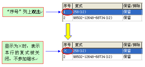 在某行复式的“序号”列上双击,数字序号变为“×”时,表示本行复式不参加缩水,再次双击可恢复。