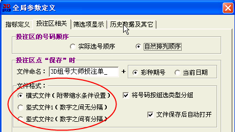 参数设置里,投注区保存的时候可以选择文件格式为横式或竖式等,只会生成一个文件。(原来选择竖式后会生成2个)。