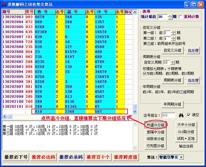 (打开3D组号大师,点分组分析按钮,然后点热温冷分组,就可以显示出往期分组情况和下期分组推荐)