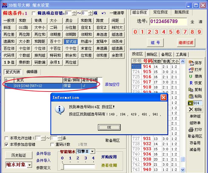 第二步,点选号缩水后打开缩水界面,如下图,然后我们选择复式组筛选条件,还以为刚才的热温冷分组断组为例设置为:019|2348|567=12,表示这三组只出1组或2组(也就是排除1组),然后点继续过滤后,看下投注区只剩下700多注,并且下期奖号914在投注区,我们这个条件分析设置就是正确的,这只是简单的一个条件就可以稳定杀掉200多注号码,如果您还以其它的断组方法还可以在复式组里添加很多个,而且还可以给这些断组设容错等等。如果您还有其它的问题或疑问可以QQ:510439338或电话13661271349联系我们,我们会尽心解答。
