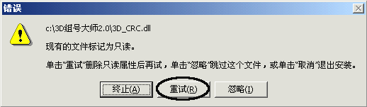 4、一定要注意:如果安装过程中出现类似下图,请点“重试”按钮。